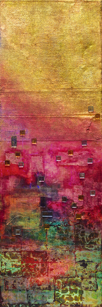 acrylic, metallic ink, metallic leaf, glass tile, burlap on linen canvas with painted edges