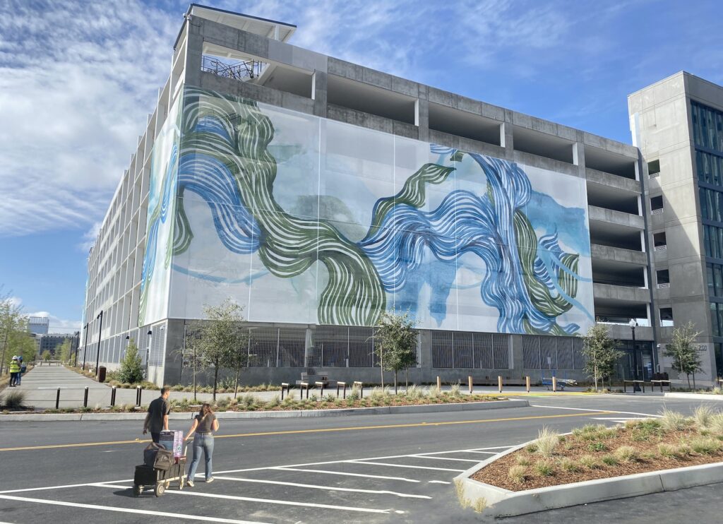 Esta obra de arte está inspirada en la confluencia de los ríos Sacramento y American, muy cerca de donde se encuentra este complejo de oficinas. Los dos ríos traen agua dulce de las Sierras, se encuentran y se vuelven uno en Sacramento. Esta convergencia de dos corrientes de agua y energía —creando un flujo dinámico y transformador— es una metáfora del flujo de la vida, una transición del pasado al futuro y la fusión para crear vitalidad y conexión. Celebrando las propiedades curativas y relajantes del elemento agua, invita a los espectadores a ser testigos de los desafíos y oportunidades que enfrentamos en un clima cambiante, una oferta y una imagen edificante y positiva.