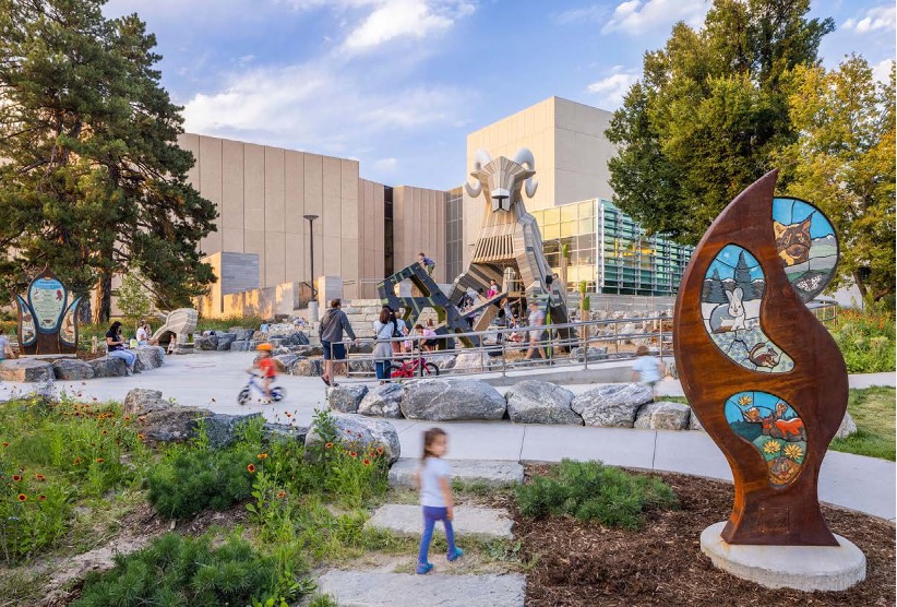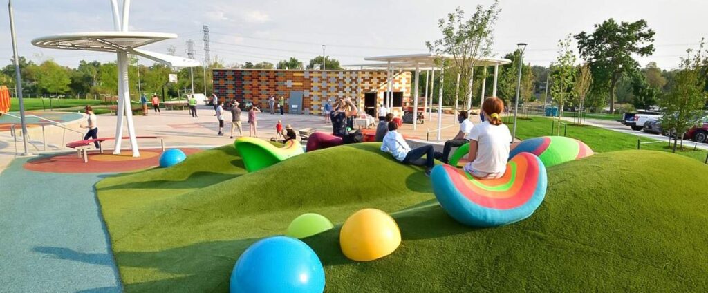 Public artwork may include sculptures, murals, artist-designed shade structures, interactive elements, or integrated features that enhance the playground elements play experience. All artwork should be thoughtfully woven into the playground or shade areas and reflect values of accessibility, creativity, and community.